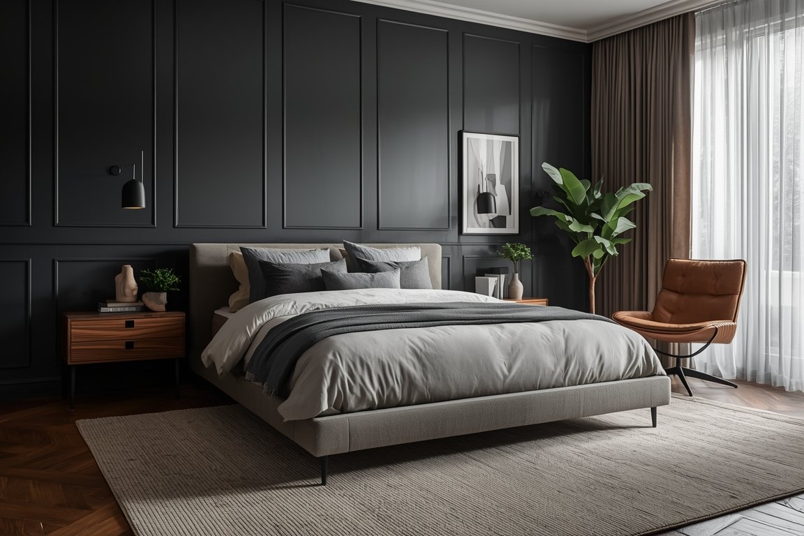 This one’s all about clean contrast and crisp lines. Picture matte white walls, a jet-black upholstered platform bed, and a charcoal wool rug that anchors the entire space.